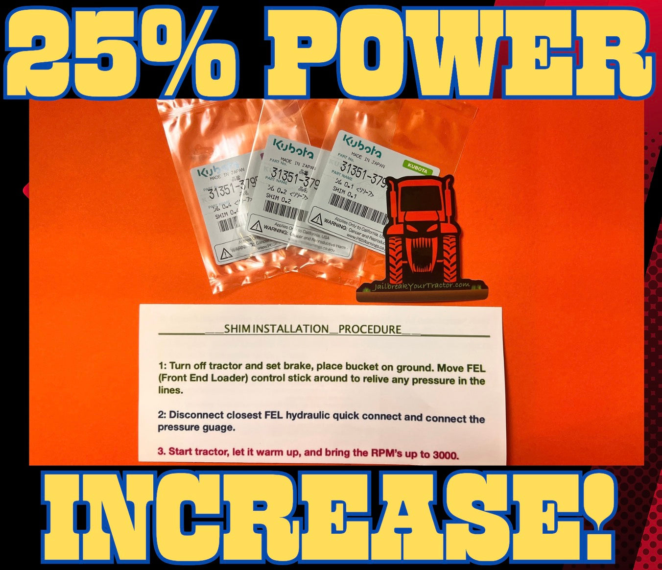 Kit includes full color instructions with pictures, plus 3X Genuine Kubota Shims Increase the Hydraulic Pressure of your tractor! Adjustment Kit for Kubota BX, MX, TLB, B and L Series and many other Kubota models....
