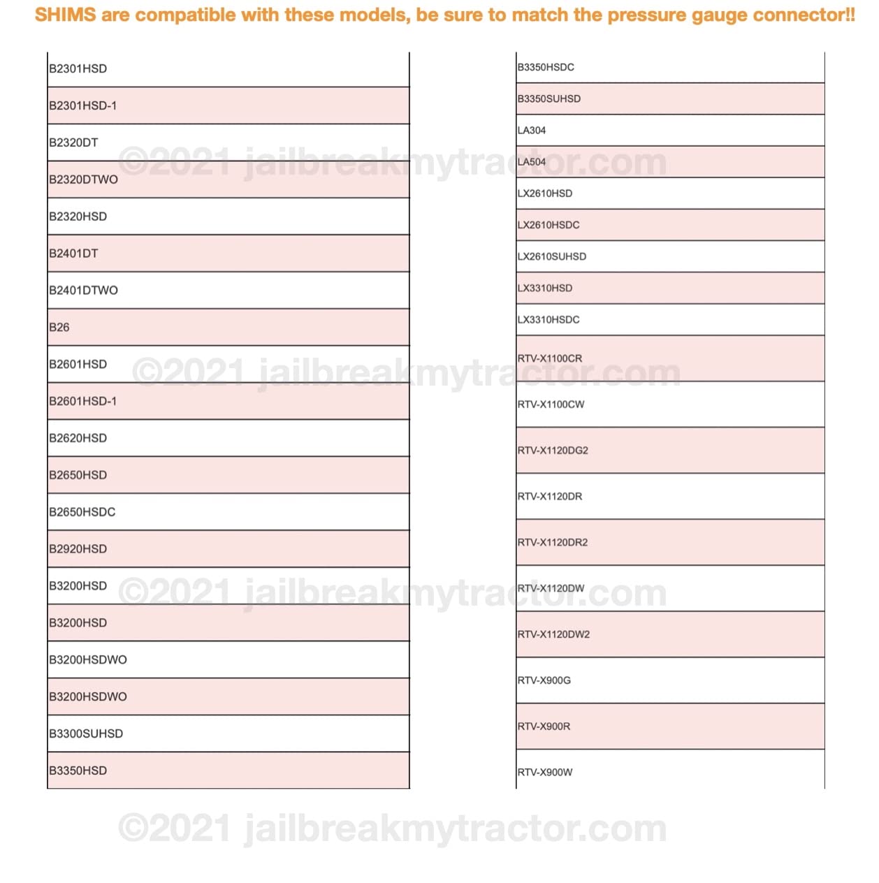 Kubota Increase Hydraulic Pressure Adjustment Shims for Kubota BX B L MX +25% Power