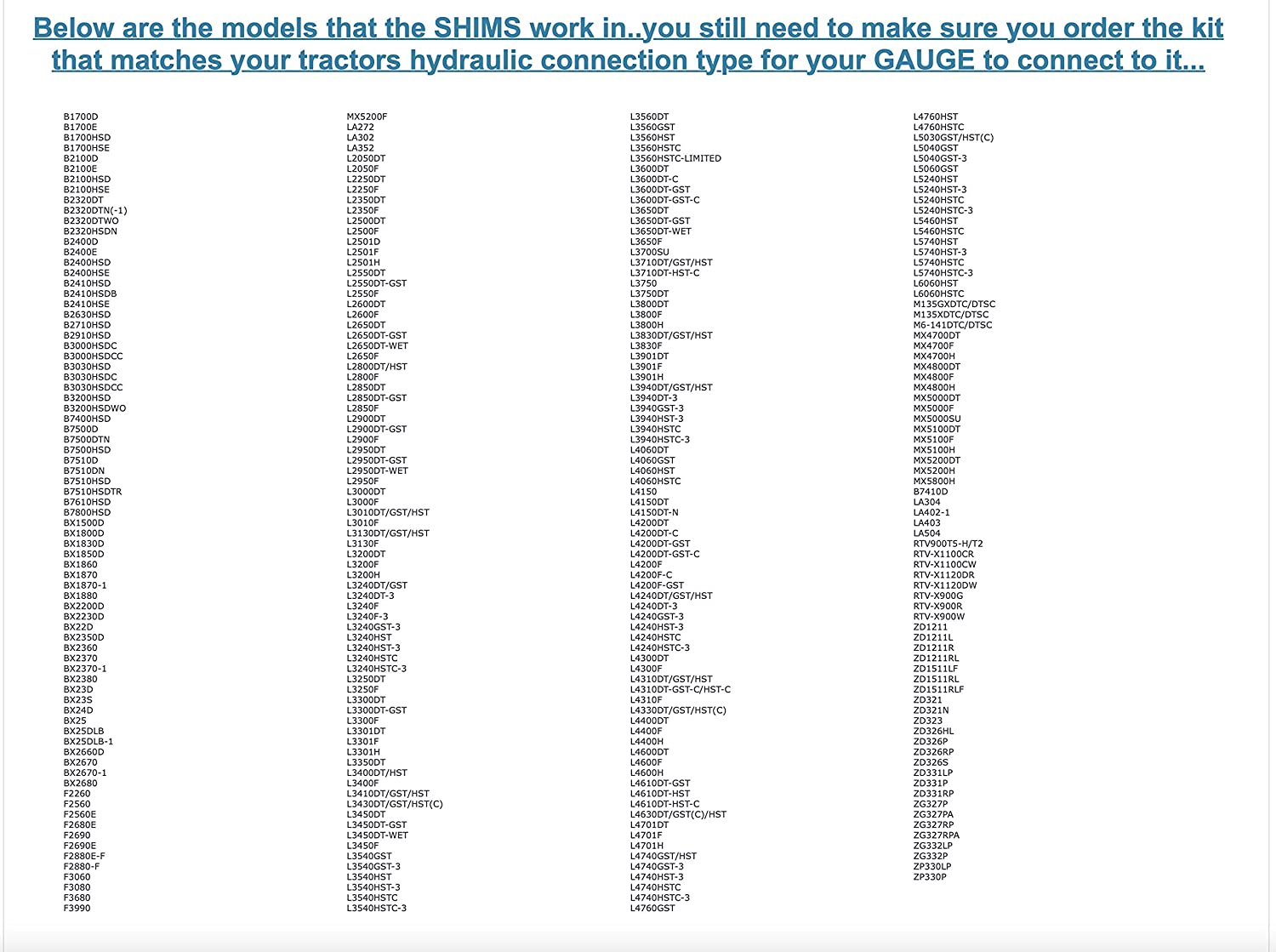 -This kit is applicable to 99% of L, MX and many other larger Kubota tractors made within the last 25 years (even idf you machine is not on the charts pictured)... .HST AND manual clutch. Note: The Kubota M does not use shims to adjust pressure. Please contact us if you have a "swift-tach" loader (rare)..or an aftermarket loader..you may need a different hydraulic connector.
