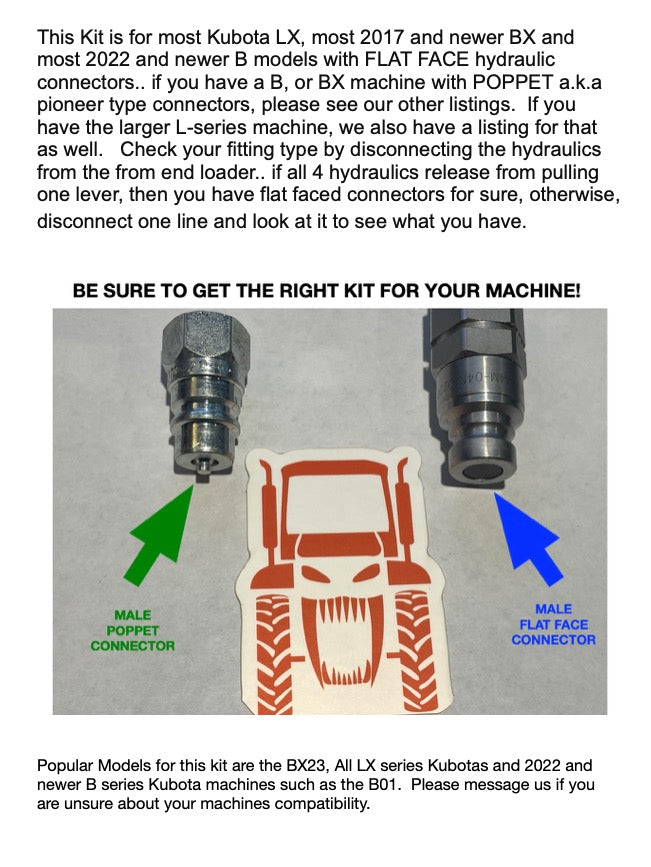 This listing includes a 3000 P.S.I oil filled pressure gauge with a high quality "FLAT FACE" style coupler (see pic). If you need the older (pre 2017), more common "poppet" style connector for your BX, please see my other listing. I also sell kits for the larger L-Series machines. Be sure your male hydraulic fitting looks like the one pictured..pay special attention to the length.